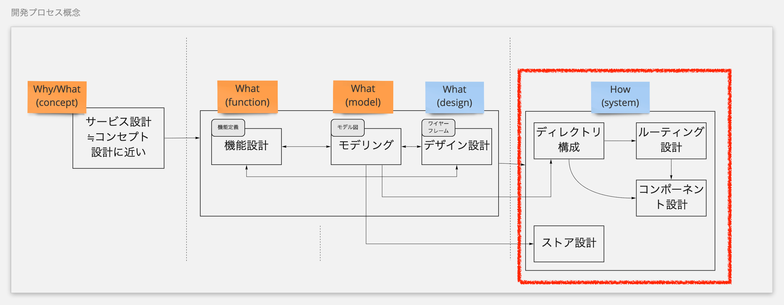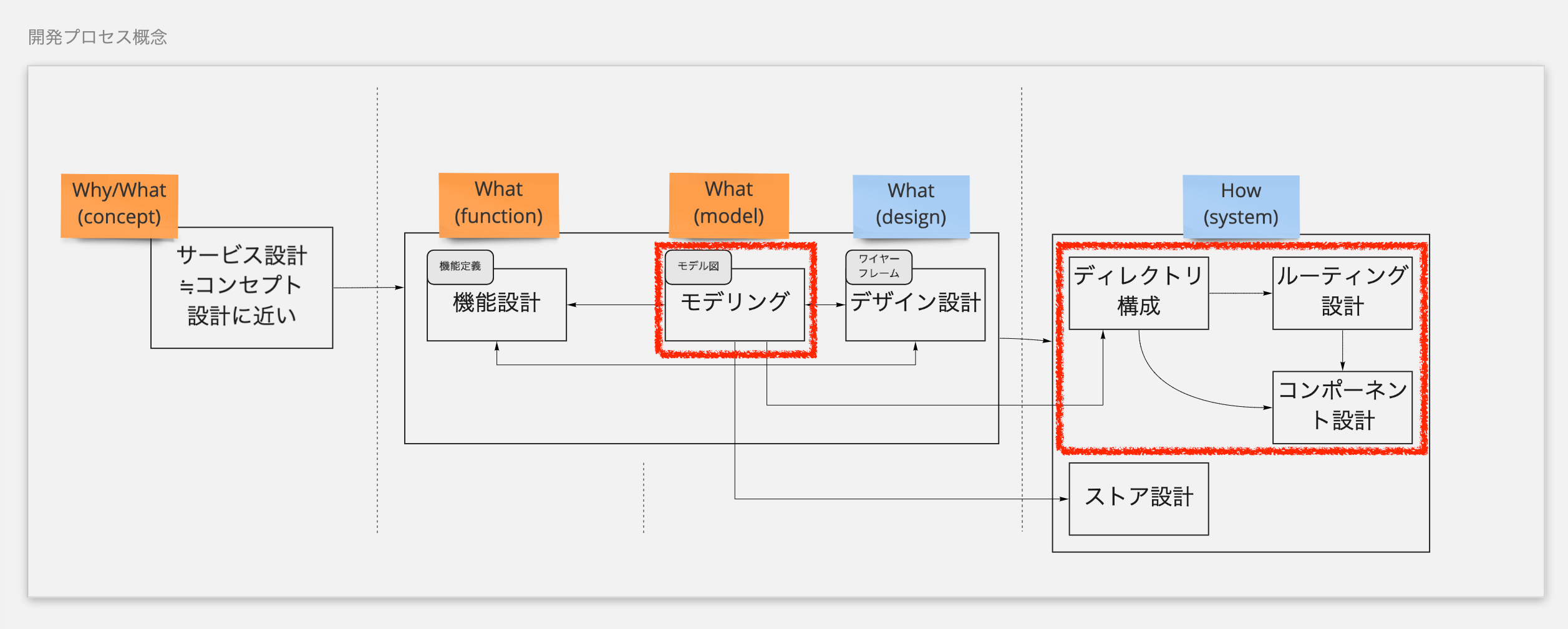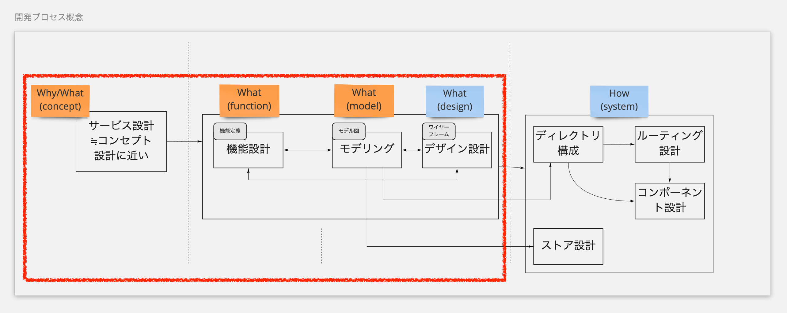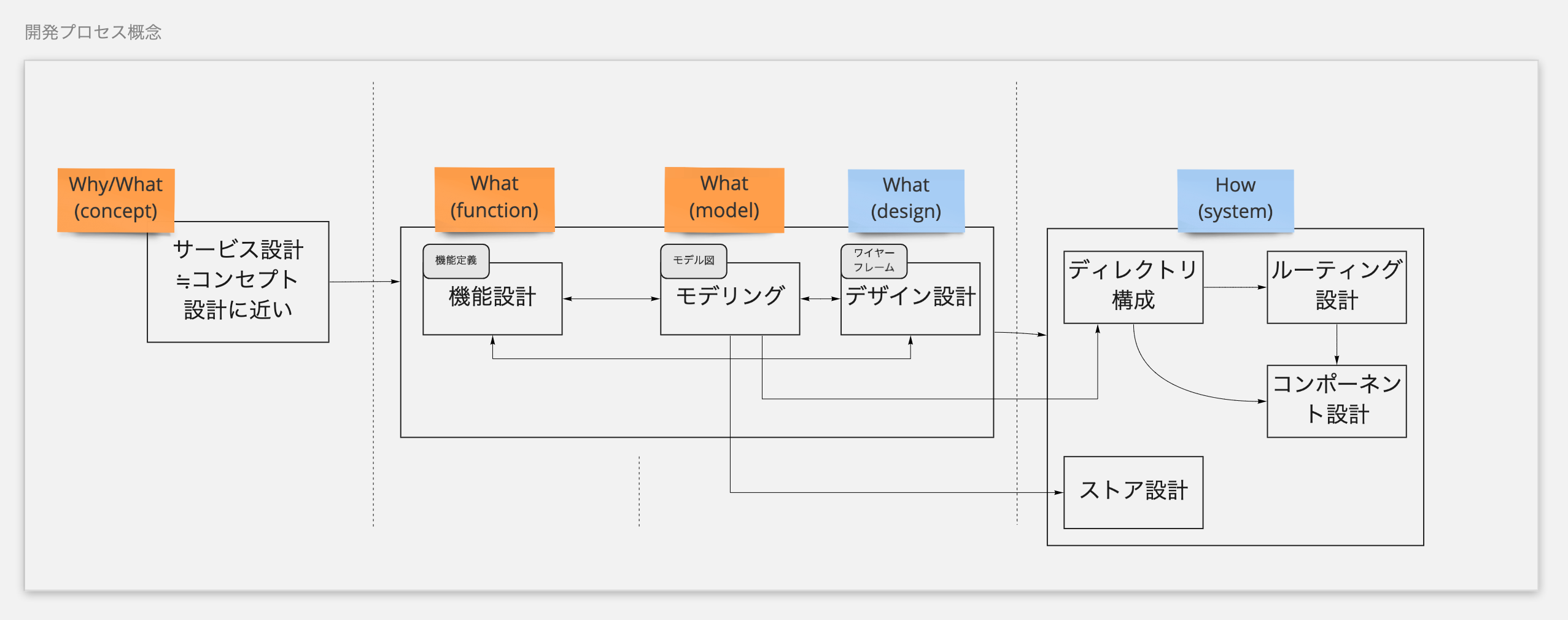 設計概念はあまり一般では使われませんので、このブログでは下記の開発プロセス図にあるような、考える要素の総称(ex:サービス設計、機能設計、モデリング、ディレクトリ設計etc...)を設計概念と定義することとします。