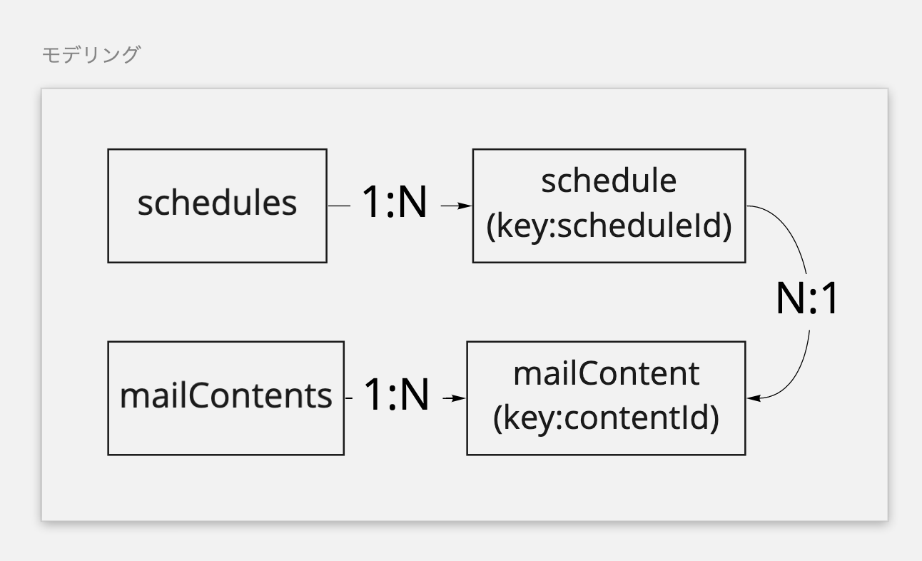 上記2つのモデルの関連ですが、schedule 毎に一つの mailContent が紐づくので、schedule : mailContent は N:1 となります。