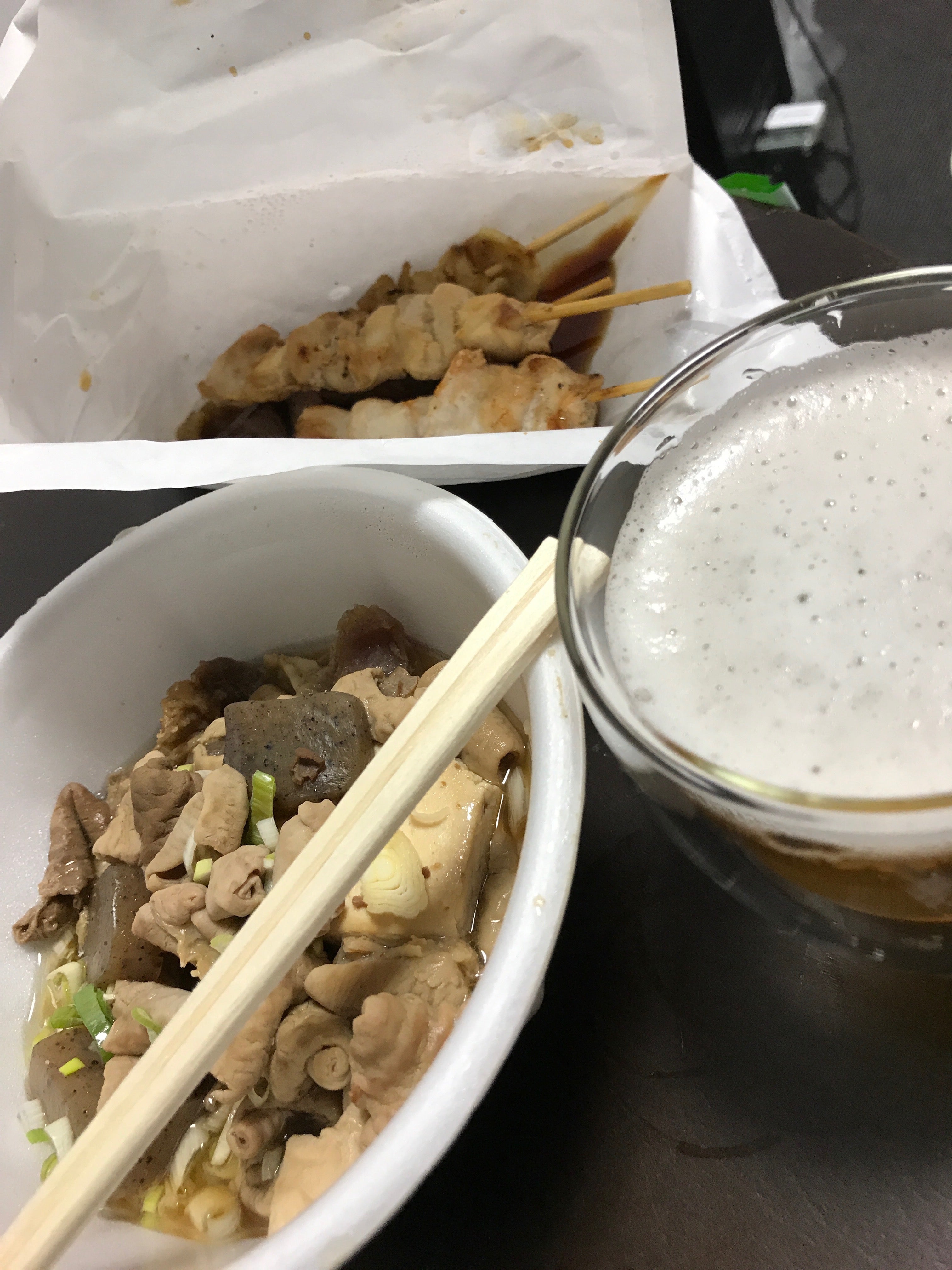 近くの居酒屋さんからテイクアウトしてきたもつ煮込みと焼鳥でおっぱじめます。