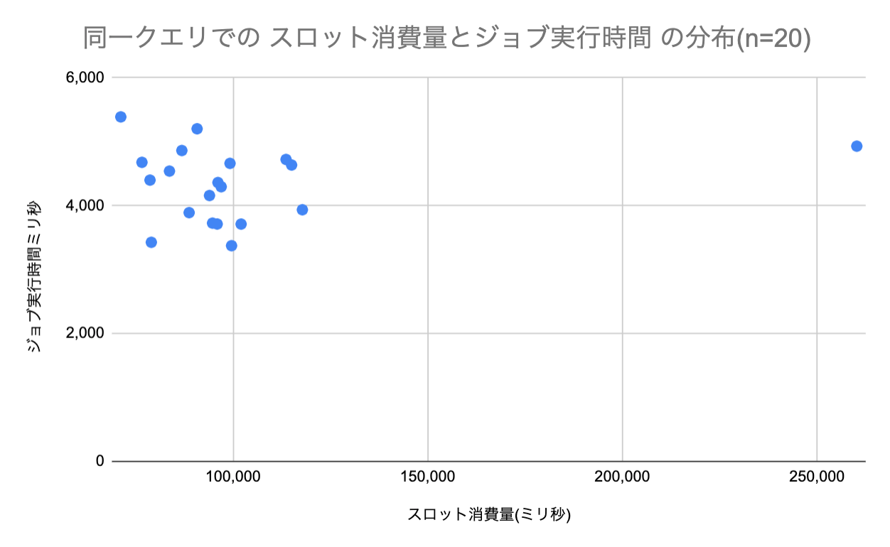 最小: 3,374両指標を分布図にすると以下のようになりました。スロット消費量とジョブの実行時間に相関はなさそうです。
