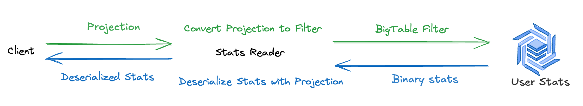 旧アーキテクチャではほとんど全ての統計情報を取得していましたが、Blitzでは、お客様が設定したアクションの配信設定から必要最小限の統計情報のフィールドとBigtableのフィルタを算出し、データベースから取り出しています。