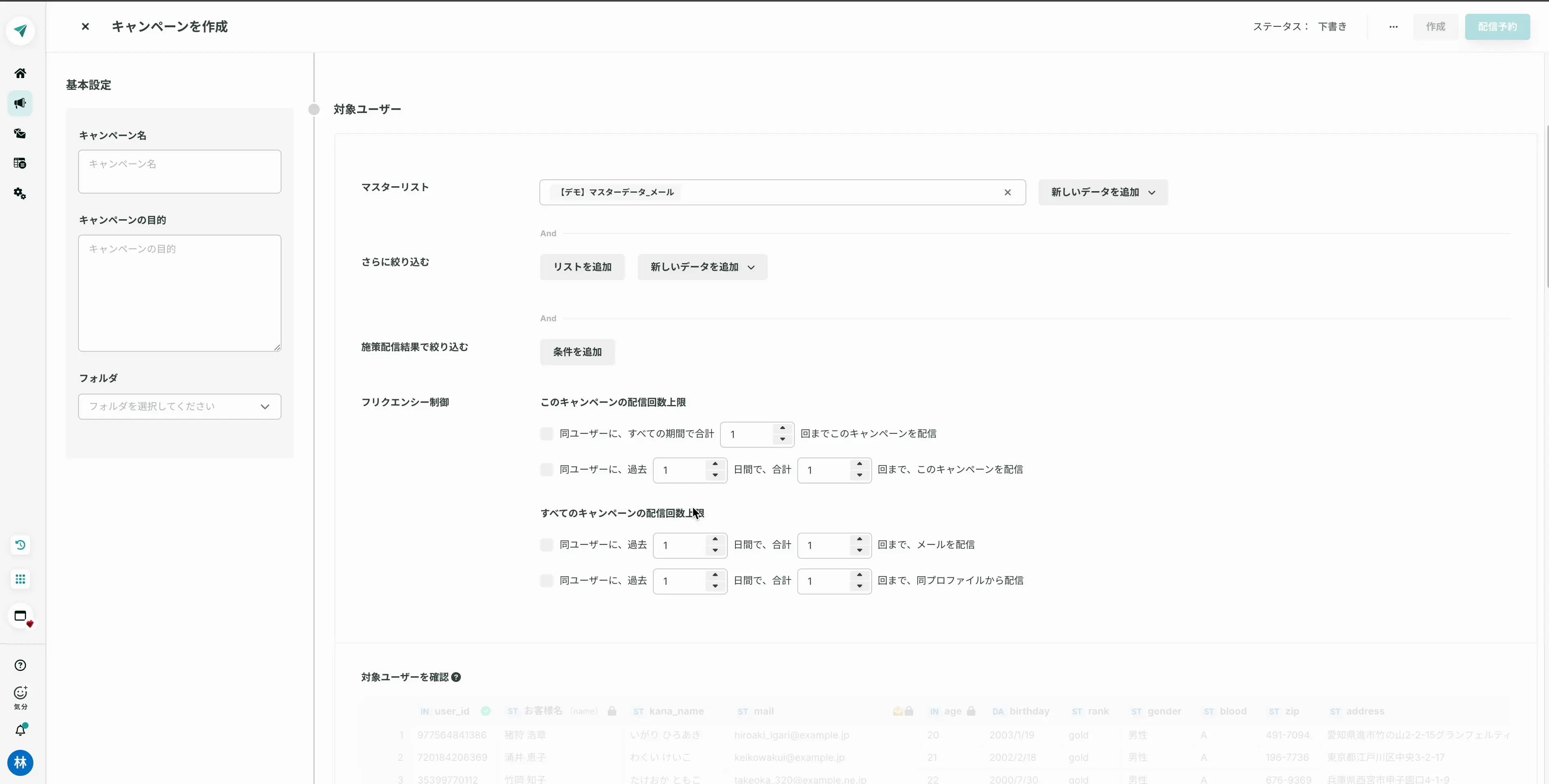 対象抽出のデータ結合に用いるキーはユーザーIDか配信先 (メールアドレスやLINE ID) を使っており、ユーザーIDのカラムがある場合はユーザーIDで結合します。