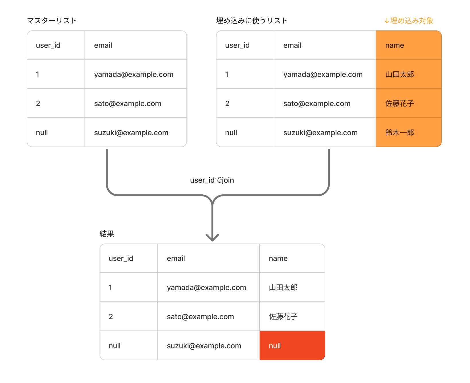 たとえば以下のようなケースだと、メールアドレスが一致していても一部でuser_idがnullになっている場合はパーソナライズする値が落ちてしまいます。