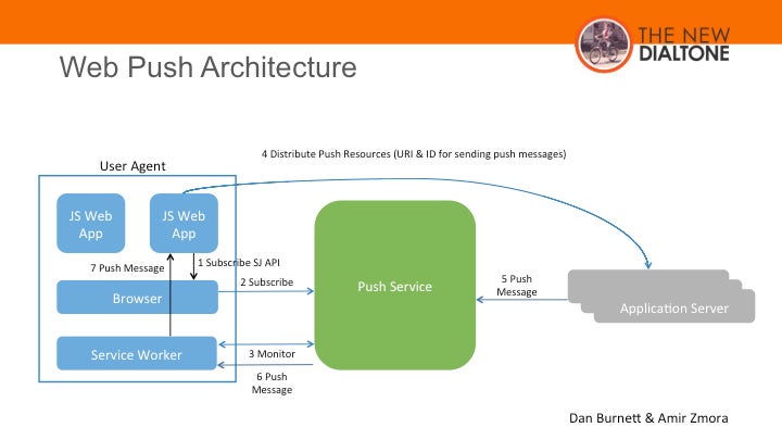 構成としてはクライアント-サーバの構造ではなく、中間に「Pushサービス」と呼ばれるサーバが介在するのが今までにない特徴です。Pushサービスはブラウザごとに存在していて、ブラウザが自動的に接続を管理しています。