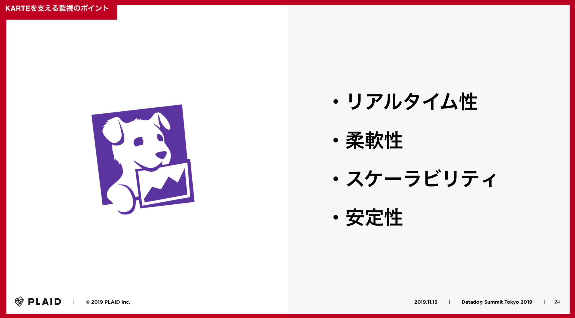 上記のサービスの特徴とインフラの特徴を踏まえて、KARTEでは監視ツールとしてDatadogを愛用しています。