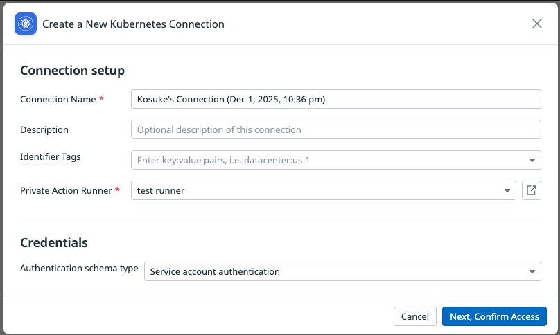 pods: ["get","list", "delete"]あとは、Private Action Runner 作成の手順に従って、Connection を作成します。Credentials は Service account authentication を選ぶのがスムーズです。