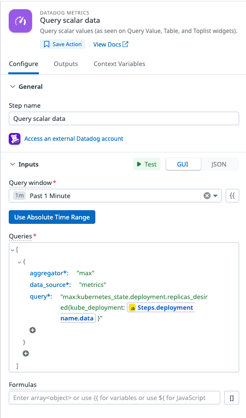 Desired Pod は Datadog Action の Query scalar data で取得し、Ready Pod は Kubernetes Action の List pod で取得しています。Query scalar data は Datadog の Metrics に対する集計値を取得することができます。Query window の最小値が1分なためどうしてもラグがありますが、 kubernetes_state.deployment.replicas_desired のメトリクスの最大値としています。