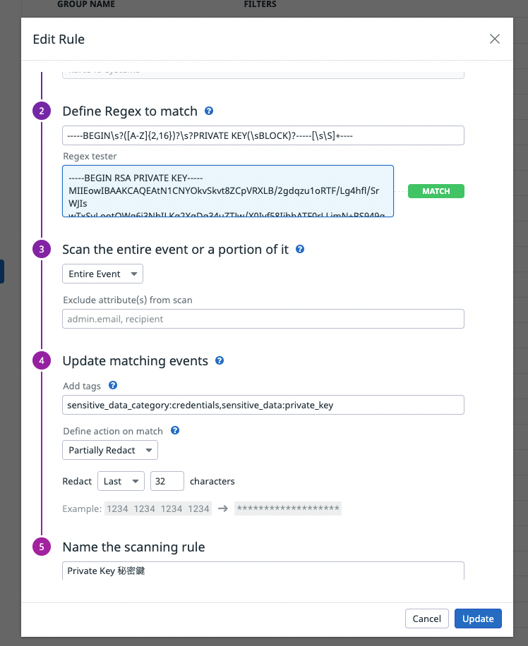 センシティブデータスキャナーでは、ログに対して正規表現でマッチングを行い、マッチしたログに対して指定したタグ(key=valueの任意の値)をつけるという仕組みとなっています。