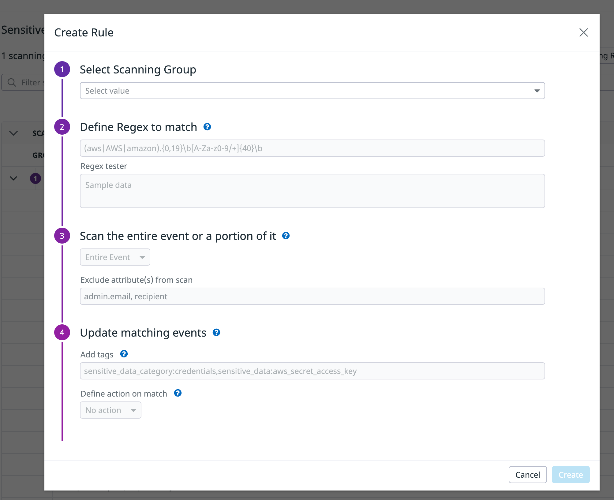 - Scan the entire event or a portion of it: ログ全体 OR ログの特定のAttributeにマッチするかを選択