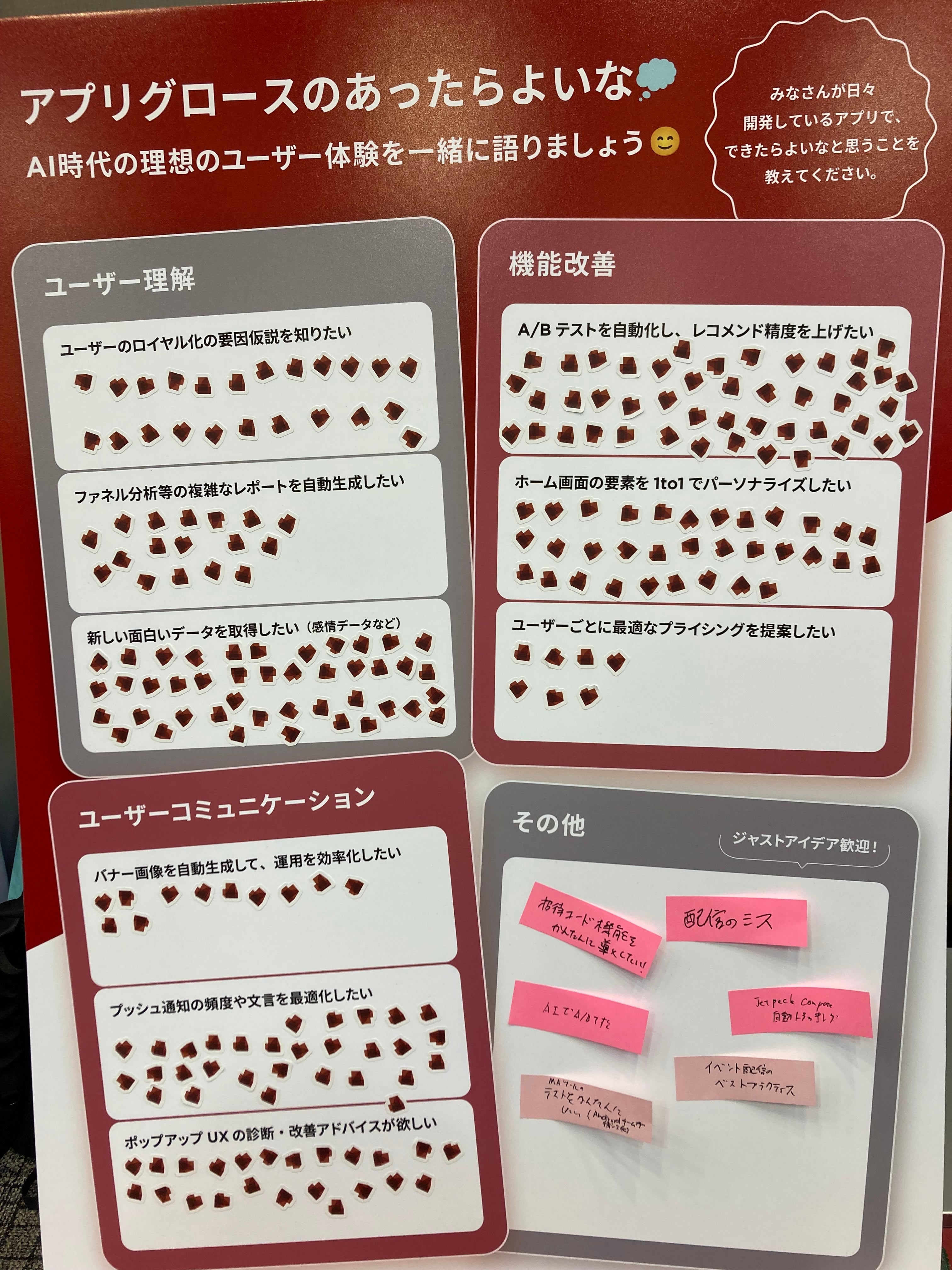 アプリグロースにまつわる課題について、該当するものにシールを貼っていただく形式でアンケートを実施しました。マーケティング寄りの質問でしたが、ほとんどの参加者がアプリグロースに関して何らかの課題を実感していることが分かりました。