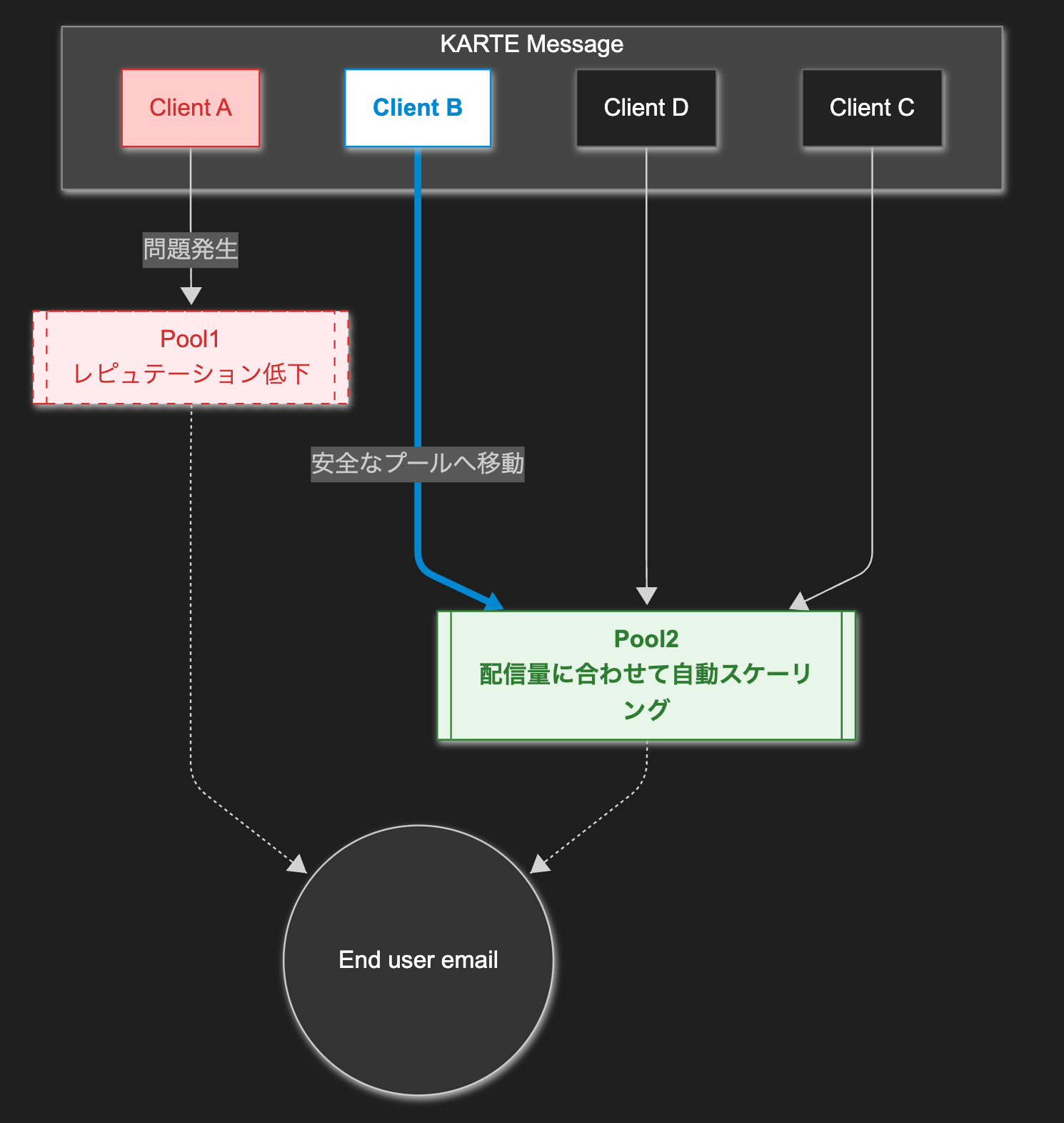 これまでKARTE Messageでは標準の専用IPプールを使った配信をしており、次のような運用をしていました。