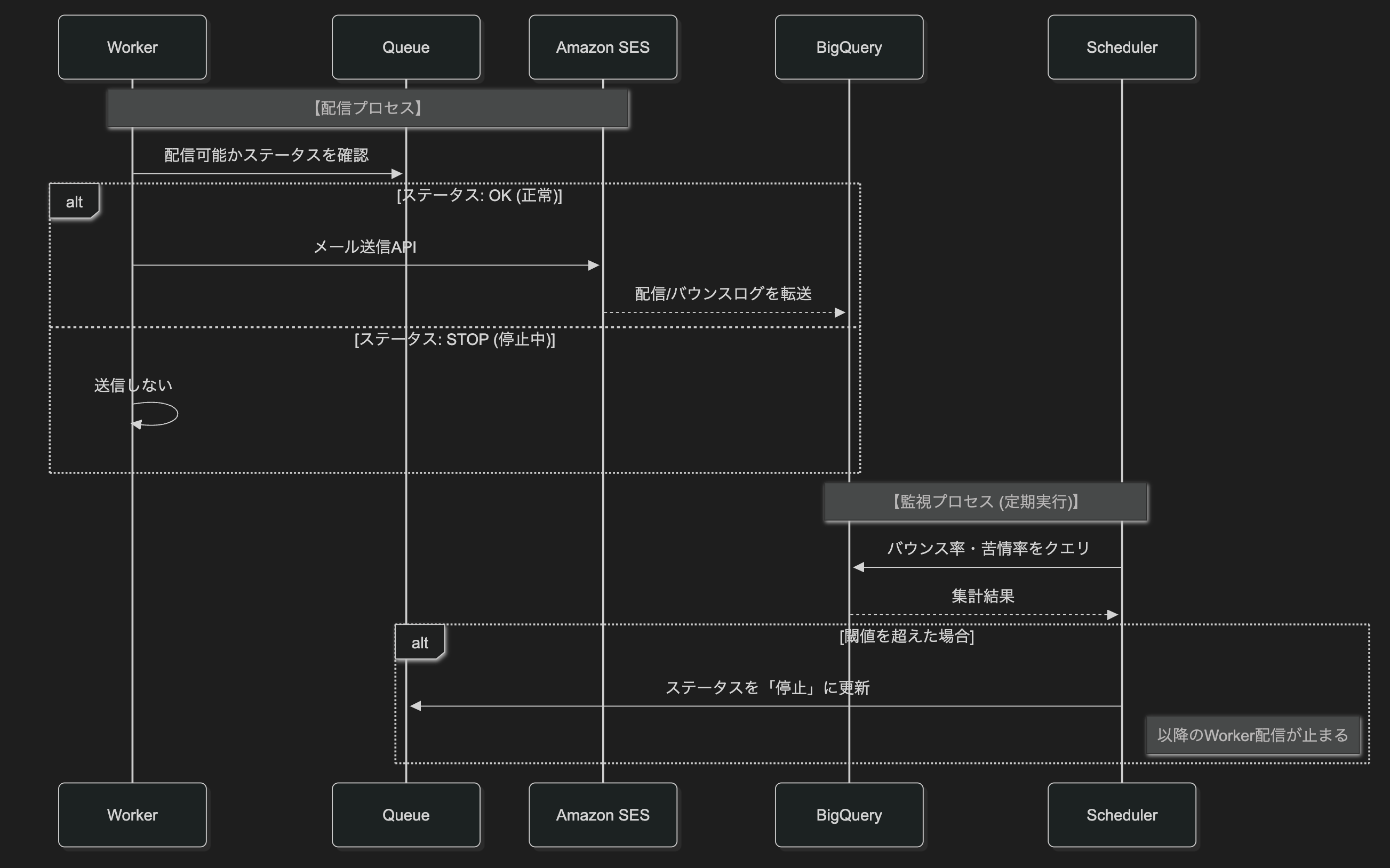 この方式だと一部の問題があるクライアントだけ配信を停止し、それ以外のクライアントは継続して配信させることができます。しかし、BigQueryのスロットが詰まってしまうとチェックができなくなります。また、クライアントが複数個の送信元ドメインを使い分けて運用している場合、問題ない配信をしている送信元ドメインも停止させてしまっていました。送信元ドメイン単位のチェックは実装コストが高く、クライアント単位でのチェックに留めていました。