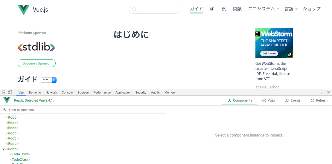 インストールすると、「Vue.js」を使っているサイトで機能がアクティブになり、デベロッパーツールに「Vue」というタブが追加されます。
