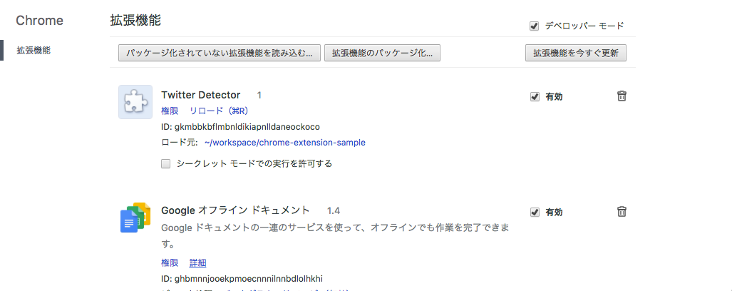 右上の「デベロッパーモード」にチェックを付け、「パッケージ化されていない拡張機能を読み込む」ボタンから、「chrome-extension-sampleディレクトリ」を読み込むます。