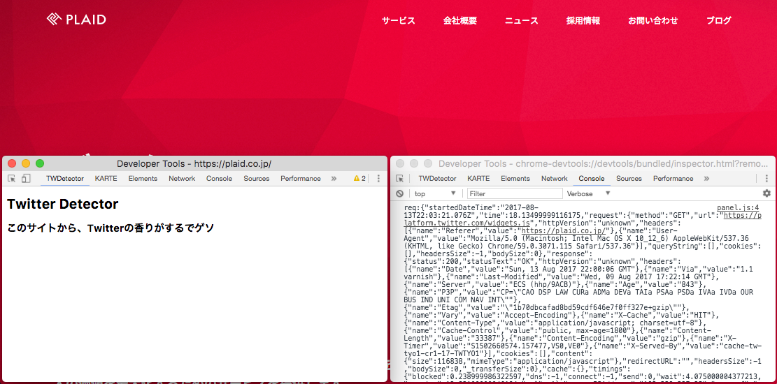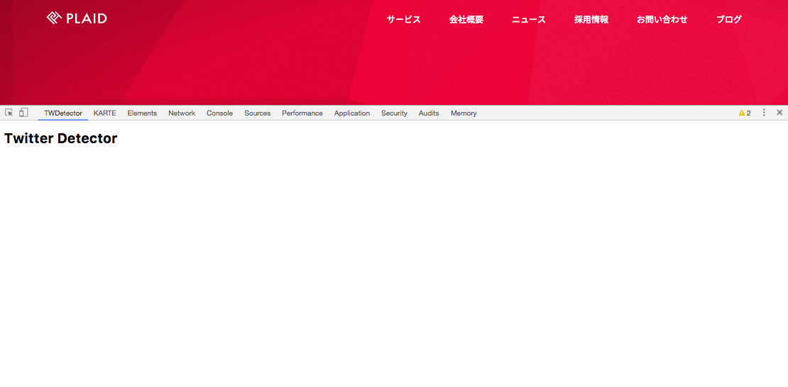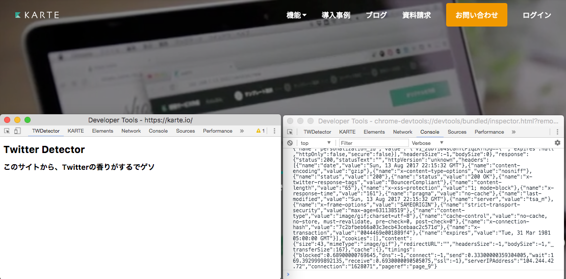 例えば、一見するとTwitterを使っているかわからない「KARTE」のサイトを、「TWDetectorタブ」を開いたまま見てみます。