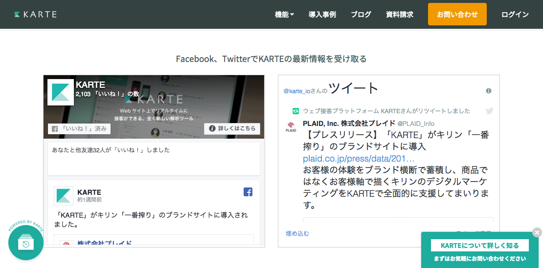 ページをスクロールしてみると、実際に「KARTEの公式Twitterアカウント」のツイートが埋め込まれていました。