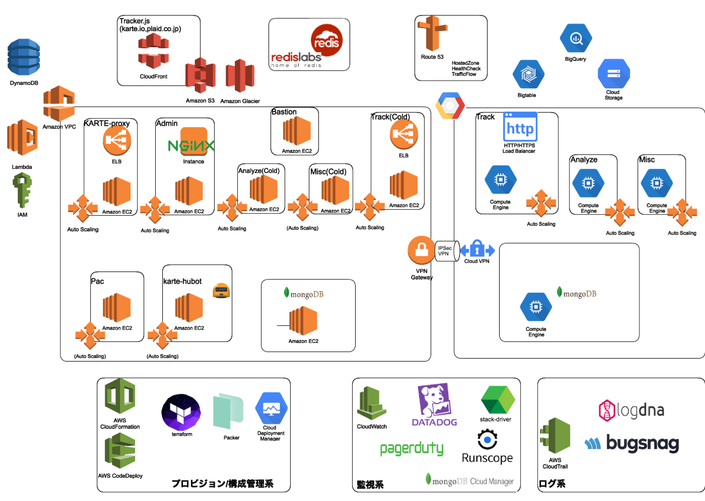 しかし、GCPのBigTableやBigQueryを積極的に利用するにあたり、latencyやnetworkコストの面からGCPにもインスタンスを立てており、現在AWSとGCPの両プラットフォームでインフラを構築しています。