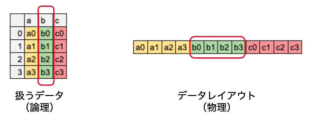 - データのファイル形式は列指向なデータレイアウトになっています。