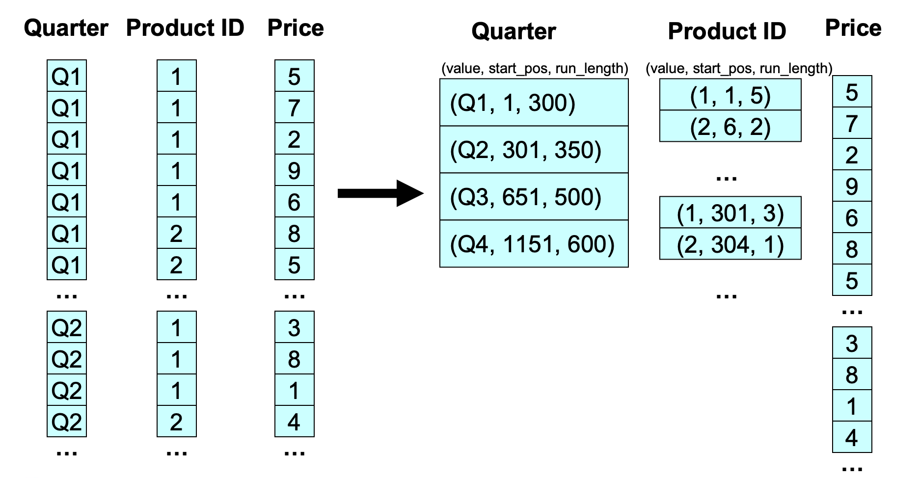 図の例は左側がもとのデータ、右側がRLE適用後のデータです。例えば右のRLE適用後のQuarterの(Q2, 301, 350)というのはQ2という値が301番目から350個続いている、という意味になります。
