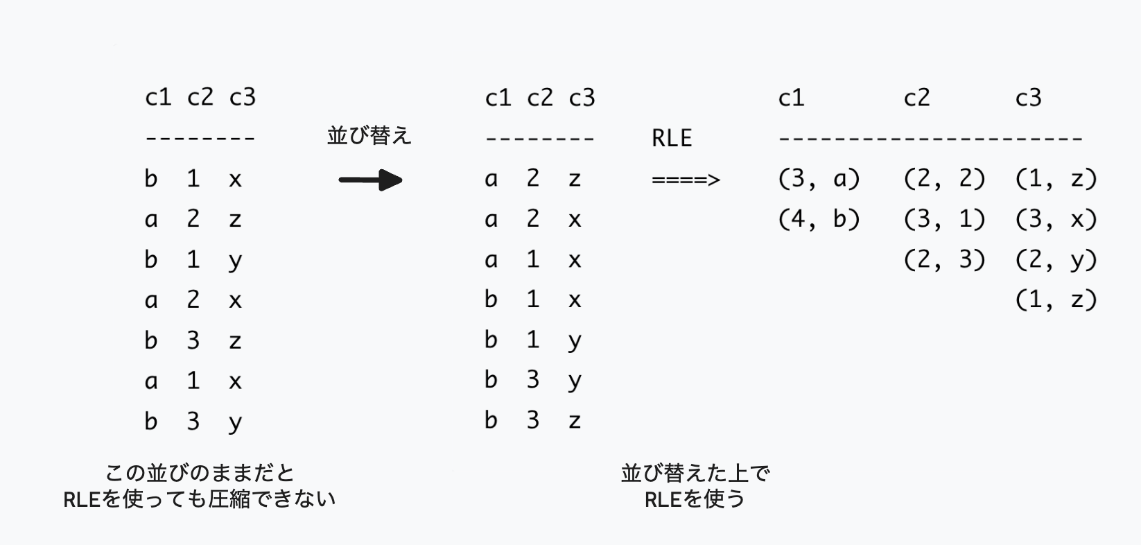 データを並び替えてRLEを適用する例。 BigQueryのブログのデータ例より