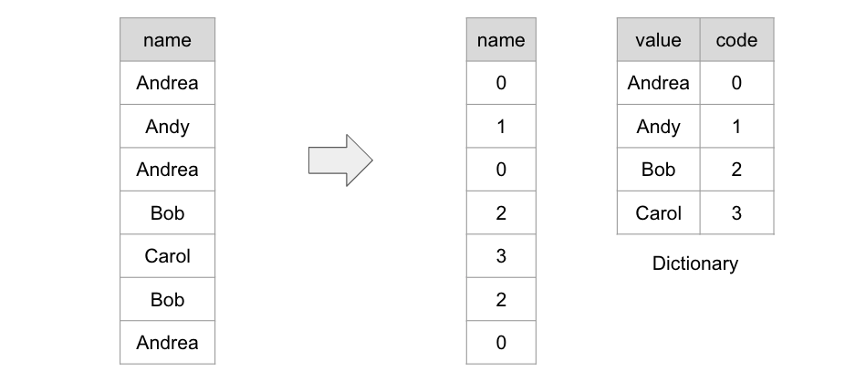 Dictionary Encodingの例。左側が元のデータ、右側がDictionary Encoding適用後のデータ。