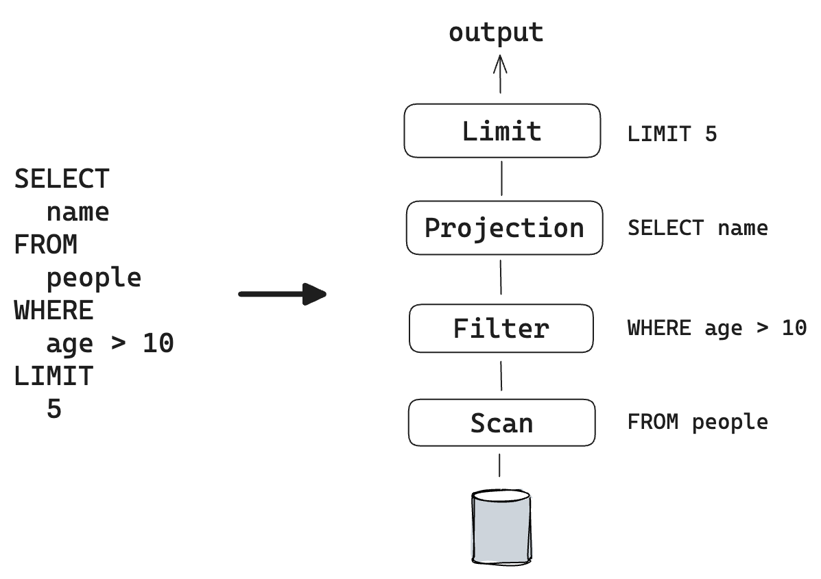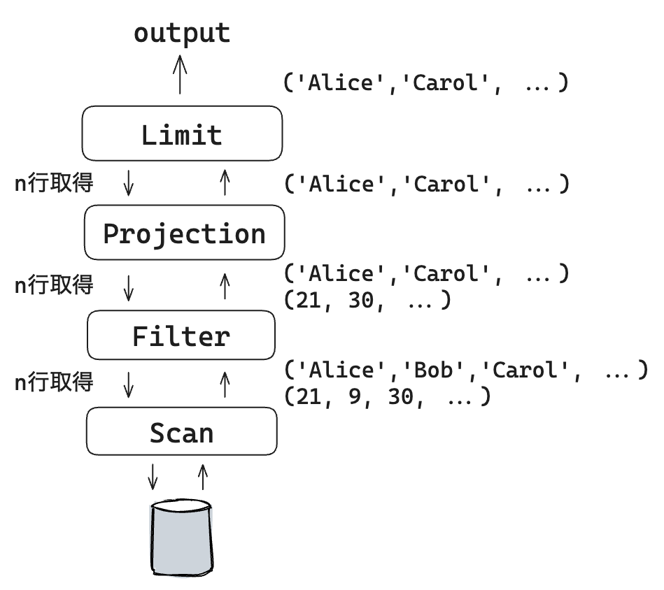 ここでの説明はかなり簡略化していますが、例えばInfluxDB 3.0の内部のクエリ処理エンジンであるDataFusionはこのようなモデルになっています。DuckDBは本記事執筆時点は少し異なるモデルに変わっていますが、初期実装は同様のモデルだったようです。