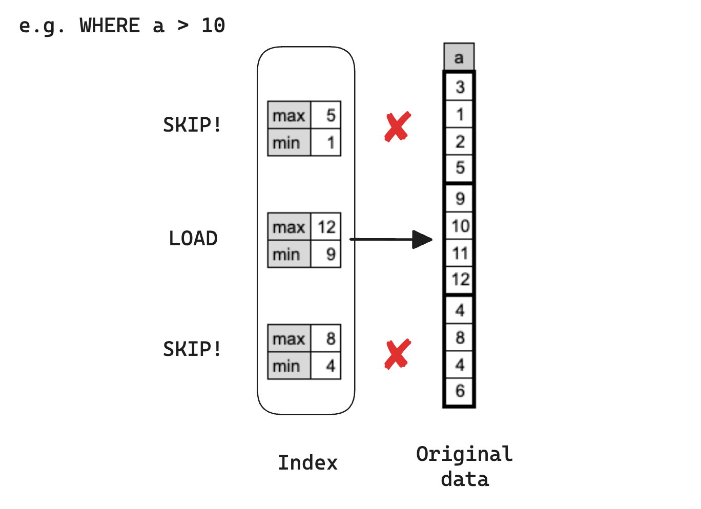 例えば複数行のまとまりに対し、事前に最大値・最小値を計算しておきます。処理の際にはクエリからそのまとまりを処理すべきかどうかを判断し、不要と判断した部分は処理をまるごと省略しスキャンを高速化します。