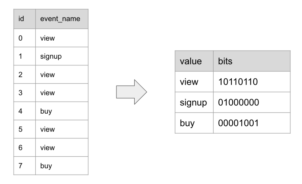 たとえばWHERE event_name IN ('view', 'buy') というクエリを処理する場合はそれらに対応する10110110と00001001 というビット列をOR演算で処理すれば、必要な行を素早く抽出できます。その他、ANDやカウントなどにも使用可能です。