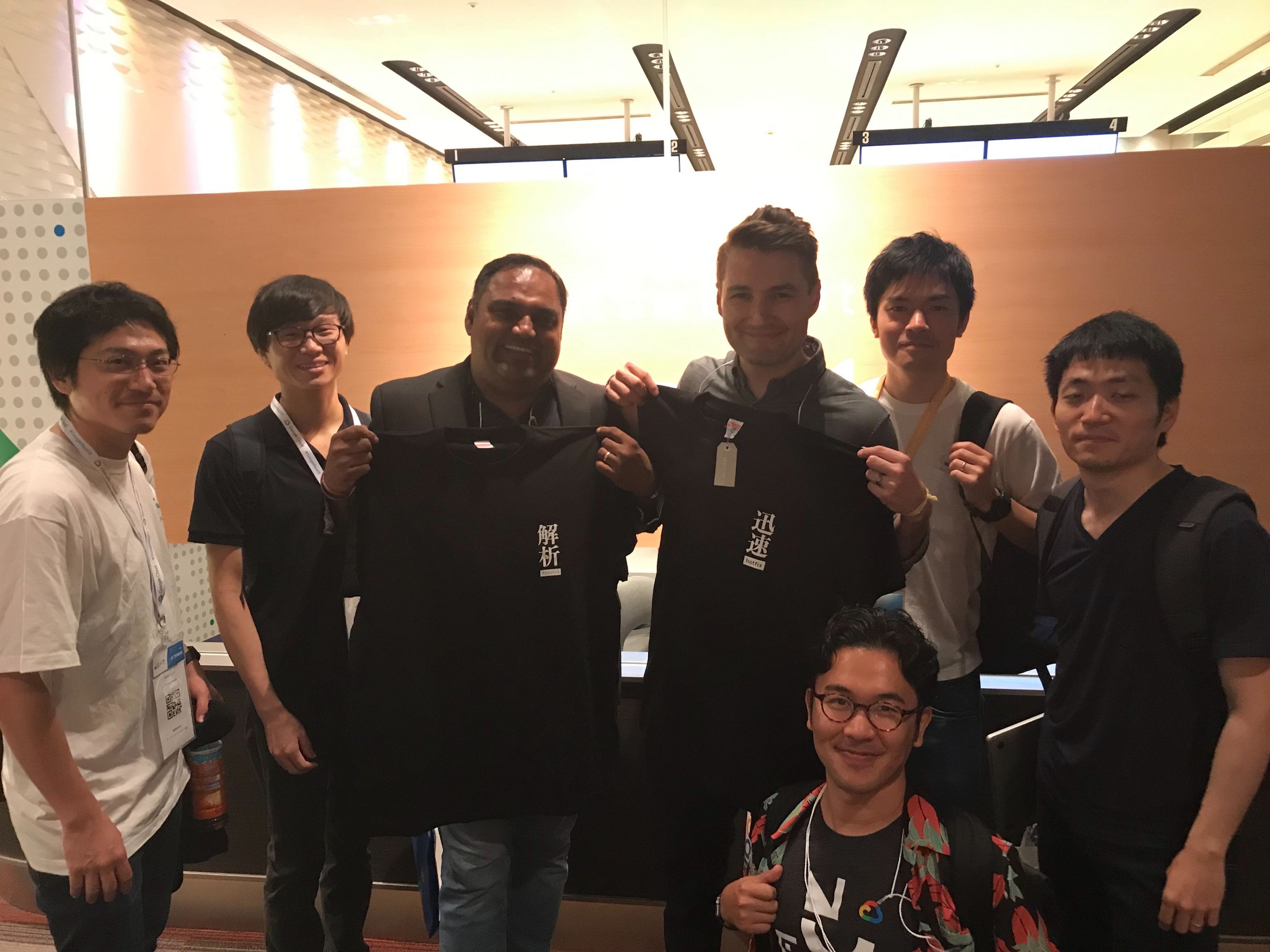 ミーティング後には、PLAIDオリジナルの漢字Tシャツをプレゼントしました!2種類あり、「hotfix: 迅速」「analytics: 解析」が書かれています。PLAIDデザイナーが心を込めて作った甲斐もあり、喜んでいただけました。
