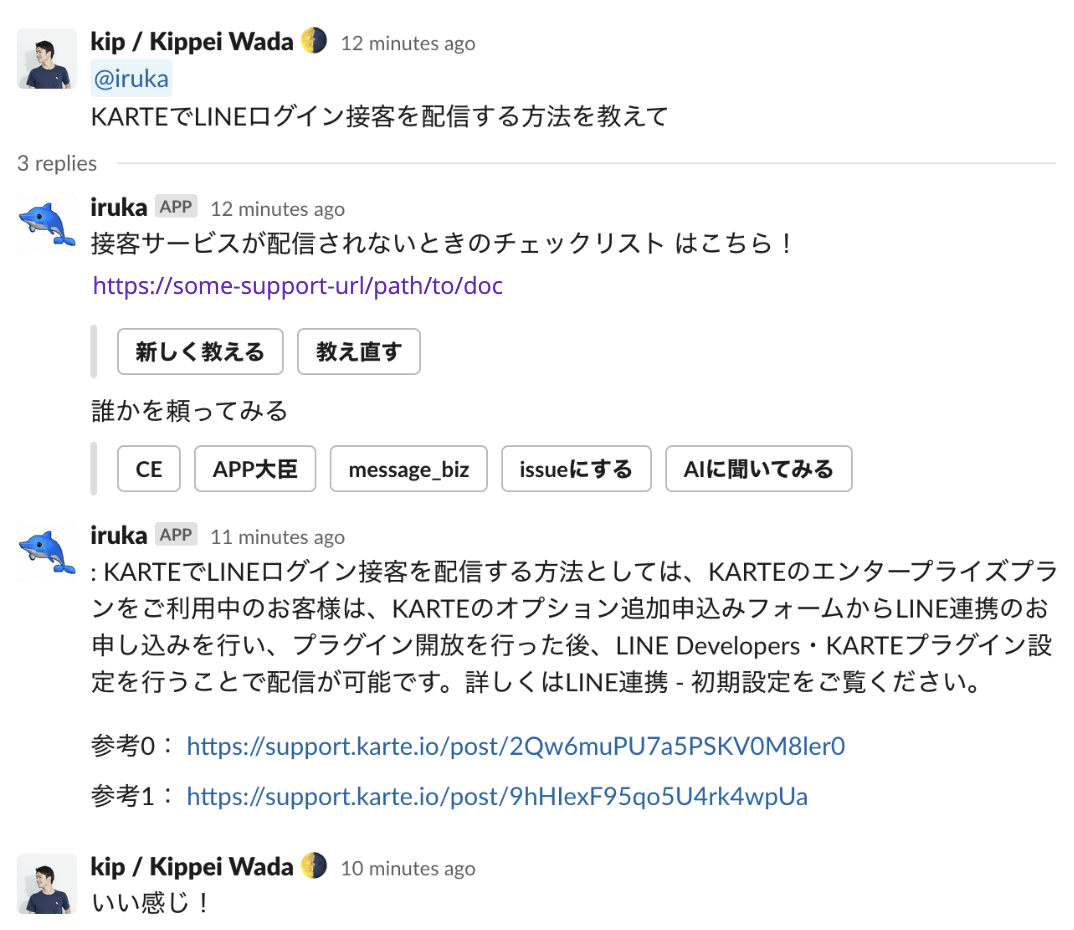 始めのルールベースの回答では、非公開の社内ドキュメントが回答されましたが、関連性の低いものでした。一方、「AIに聞いてみる」の後の回答では具体的な配信方法と参考URLを回答できています。