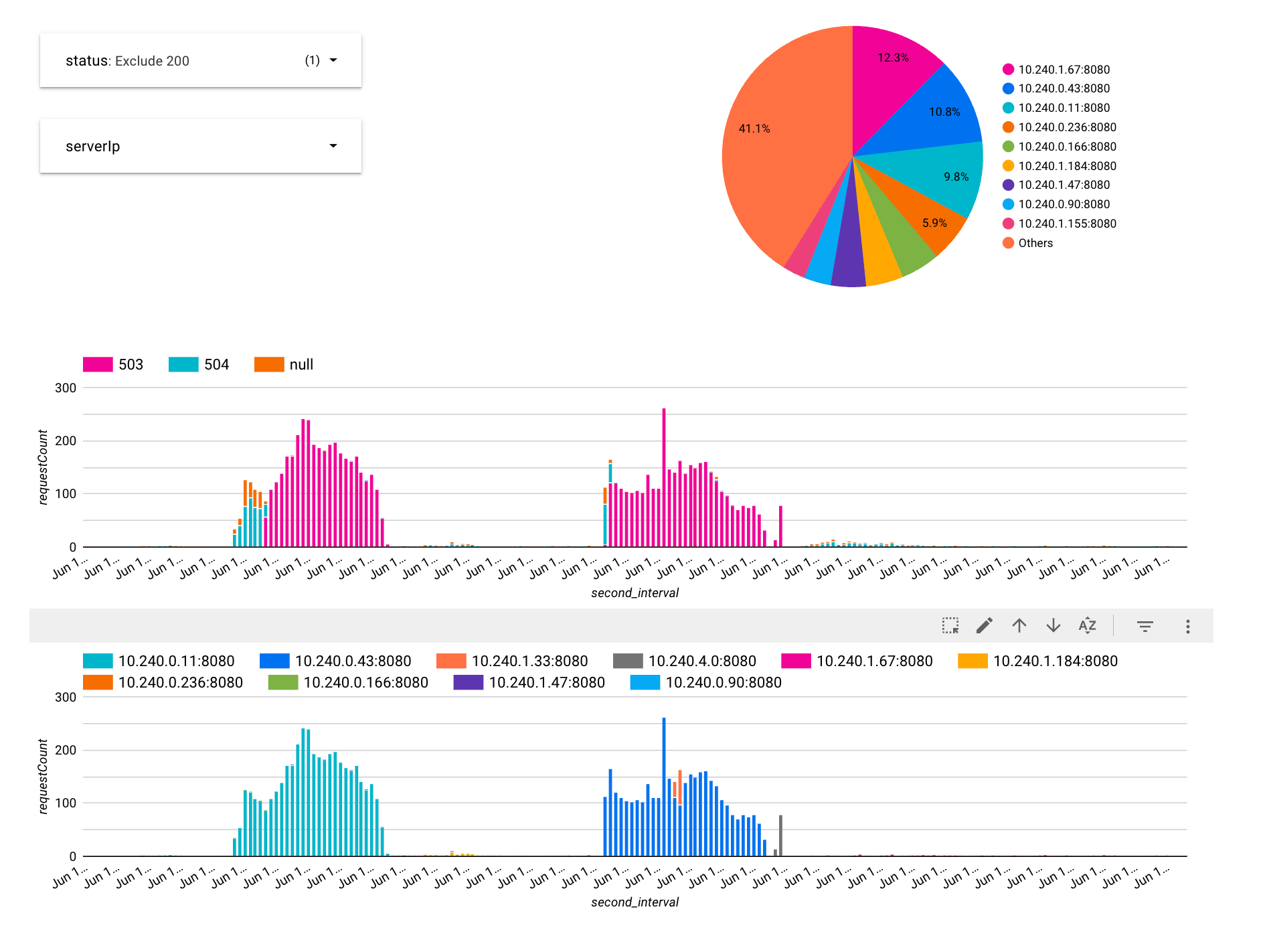 Looker Studio で結果を見ると、特定のホストから504が最初に発生し、その後503を返却することがわかりました。504発生から503を返すまでの時間幅が、Load Balancer のヘルスチェックに失敗してからサービスアウトされるまでの猶予期間と一致していました。