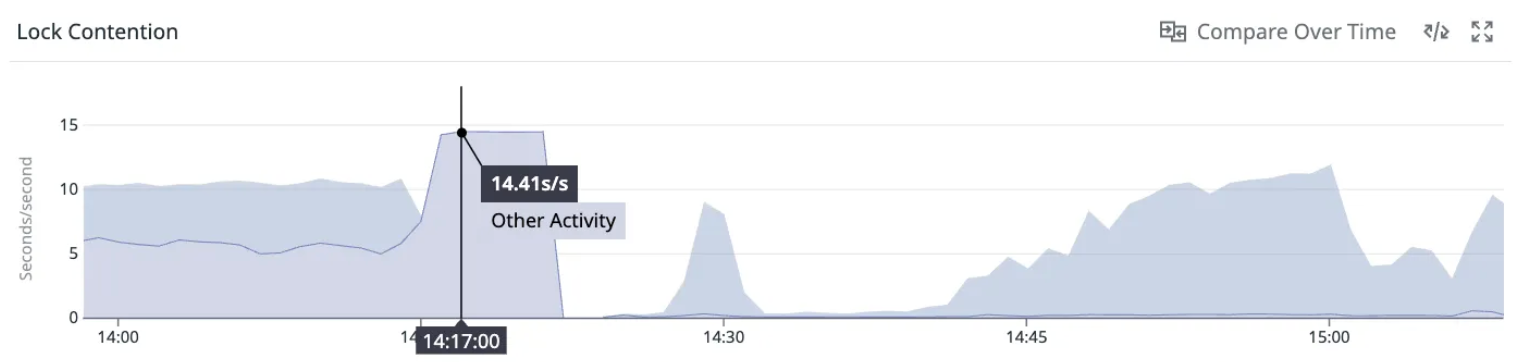 まず APM のメトリクスを分析したところ、該当時間帯に Lock Contention(ロック競合待ち時間)が継続的に高い値を示していることを発見しました。