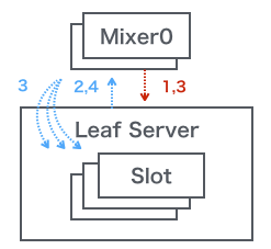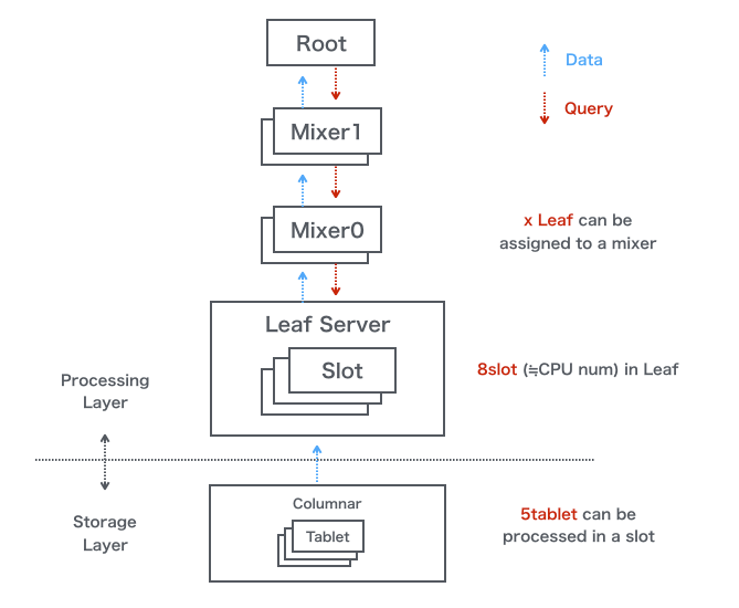 クエリはRoot/Mixer/Slotの順で伝播します。その時Slotのみで解決できないQuery要素に関しては排除されて伝播されます。Slotは実際にStorageレイヤと通信し最初の処理をするLeaf Serverのスレッドのことのようです。そして、処理結果がSlot/Mixer/Rootの順で伝播し、それぞれ統治処理が行われます。