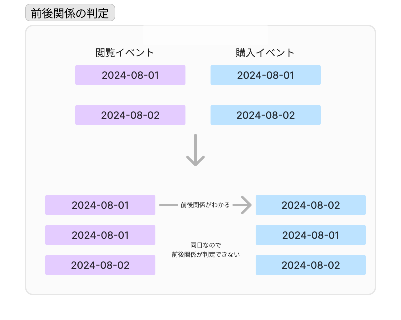 例として、仮に「商品購入」というゴールと「商品閲覧」という中間ステップを設定した場合、必ず「閲覧→購入」という一方向の流れを担保し、その関係を守っているイベントのみを集計することが求められます。