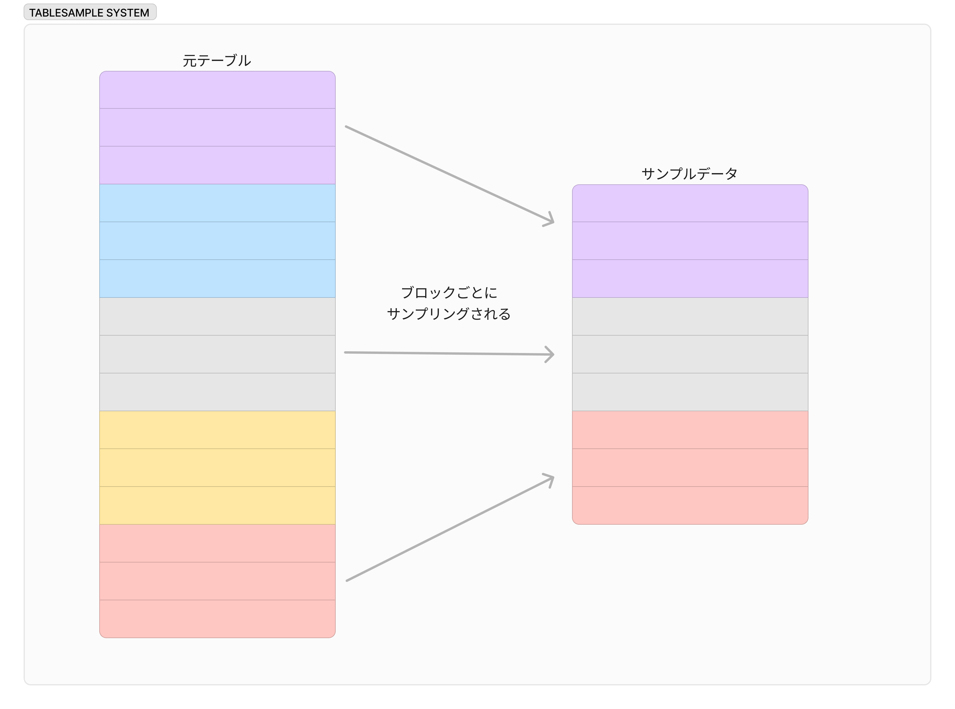 まず、TABLESAMPLE SYSTEMは行ではなくデータブロック(行の集合)をサンプリングし、サンプリングされたブロック全体を読み取る仕様となっています。
