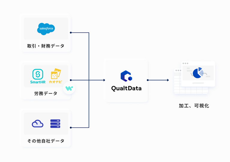 僕が働いていたQualtDataというチームでは、ノーコードで外部のサービスとデータ連携を行ったり、ワークフローを管理することができるジョブフローや、これらの機能により一元化されたデータを用いてスプレッドシートやダッシュボードを作成し、データを可視化できる機能などをサービスとして提供しています。