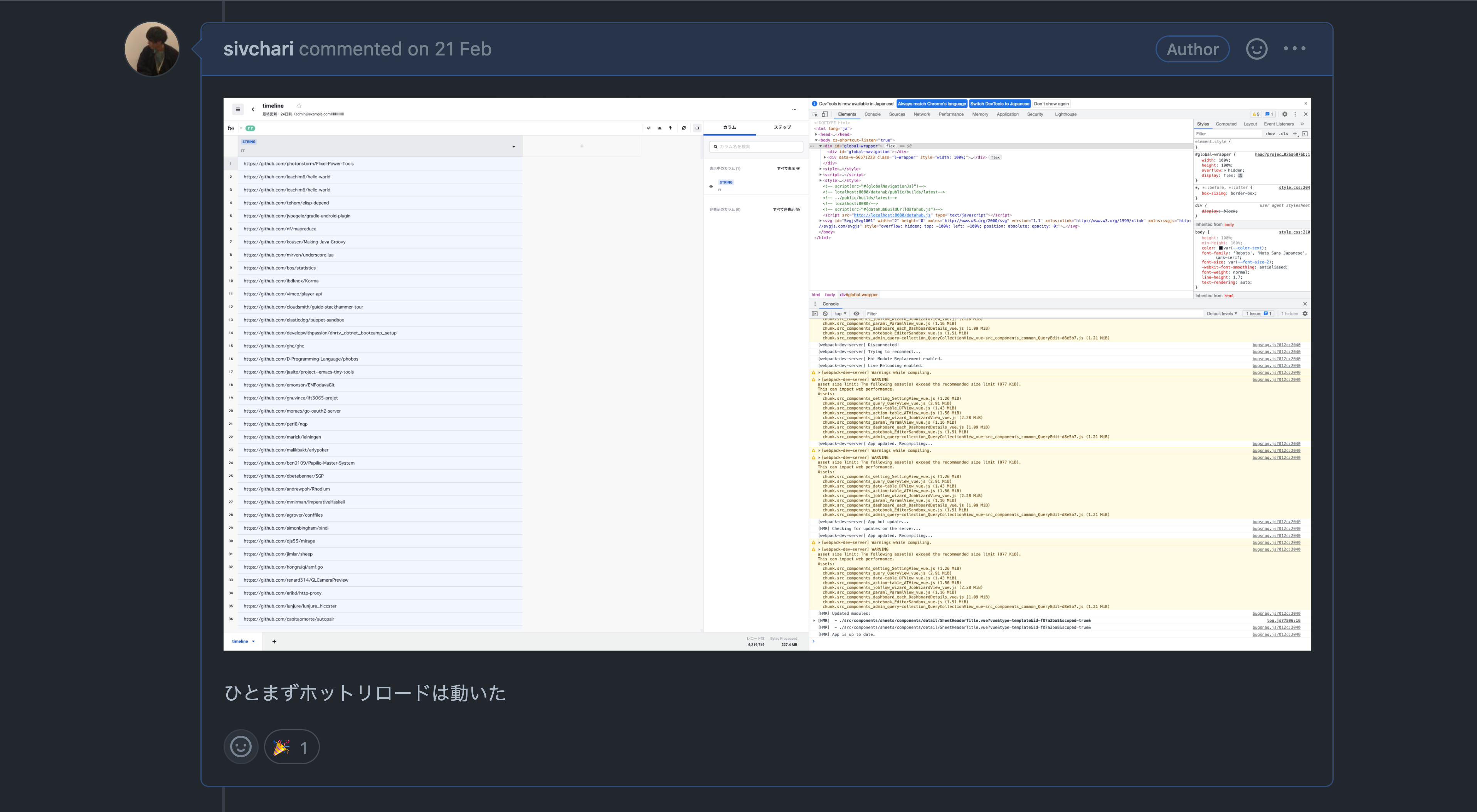 またupstreamに追従したりコードレビューのサイクルにおいて一度自分の手元で確認したい場合、仮にライブラリの追加や更新があったときに依存周りの解決がうまく行かずにエラーが出ているケースなどもありました。エラーを解決するために一度依存周りをクリアして再度インストールする必要もあったため、これによりまた開発環境を構築するのと同等の時間が必要になるという悪循環も起こりました。そのため、僕はupstreamへの追従をする際にも大丈夫かなと少し心配になったりしていました。