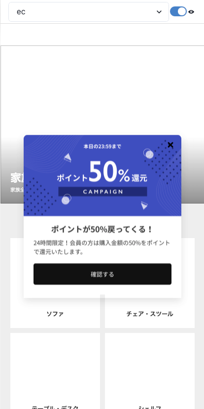 KARTE は接客と呼ばれる、自分たちの Web サイトに訪問したユーザーに適したモーダルや埋め込みHTMLを提供することができます。