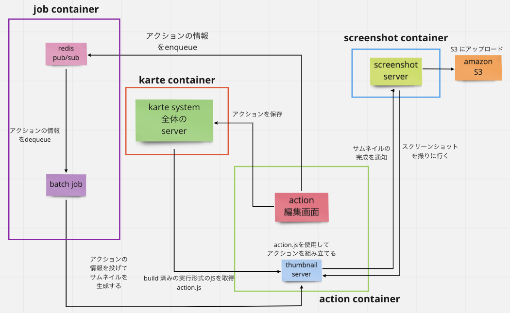 もともとあった接客のサムネイルのスクリーンショットを撮る仕組みでは puppeteer が使用されていましたが、せっかく新しいものを1から作るので、スクリーンショットの撮影には playwright を使用することにしました。puppeteer では使用できるブラウザが chromium のみですが、playwright は puppeteer で使用できるブラウザに加えて webkit と firefox を使用することができ、puppeteer のコアチームのメンバーが数人 playwright の開発をしているため、puppeteer に非常に近い書き方でマルチブラウザ対応をすることができます。スクリーンショットのマルチブラウザ対応をしたいことや、将来的には lighthouse によって接客のスコア化がしたいことなどから、今回 playwright を導入しました。