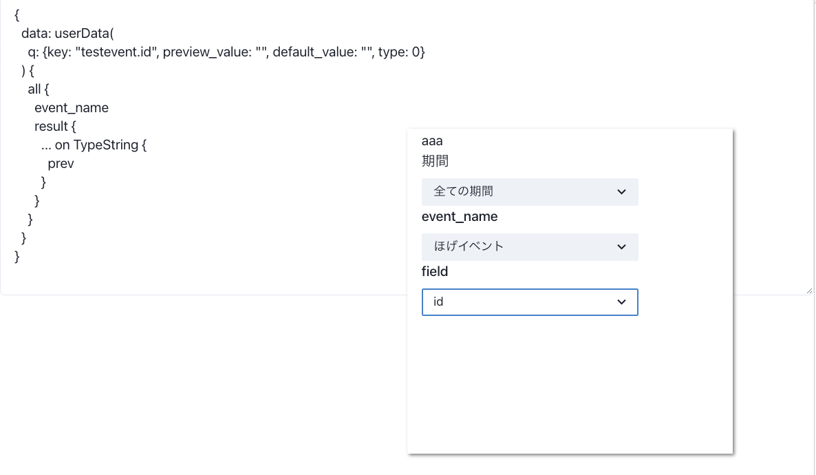 実装についてですが、9月中にできるところまで頑張ったのですが、実装は終わらなかったので引き継ぎをして退社しました。form に入力した値からランタイムで GraphQL の query を生成するということをしています。試作ですが、以下のようなモーダルの中に form があり、その form に値を入力すると動的に query が生成されるようになっています。