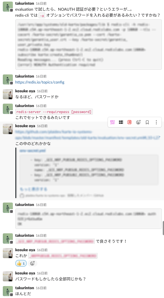 次に、redis-cli を使用してコマンドを叩く作戦にしました。しかし、その際、パスワードの認証が通らないことがわかりました。