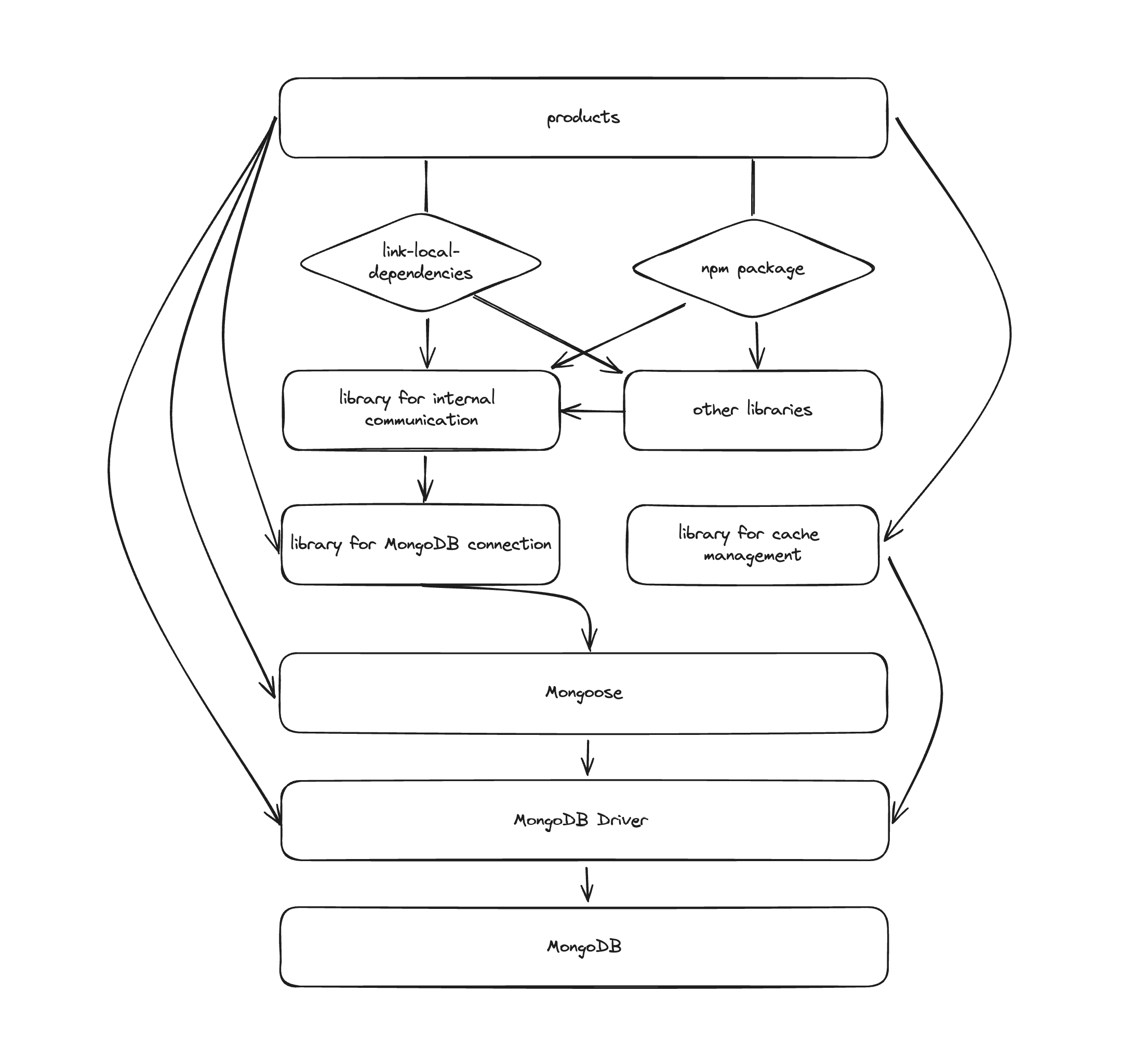 元々対応が必要だろうと目星をつけていた社内ライブラリがあったのですが、そこの修正を進めていくうちに、そのライブラリに依存している別の社内ライブラリが芋づる式に発見されていきました。さらにこの中にはhttps://github.com/plaidev/link-local-dependenciesという symlink を貼ることによってローカルの Node.js ライブラリをインポートする仕組みでプロダクトに導入されているものがあり、ライブラリのアップデートが即座にプロダクトに反映されてしまう状態になっていることがわかりました。