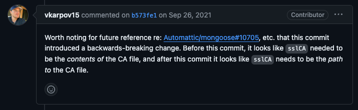 例えば Mongoose をアップデートしたことにより MongoDB への接続の認証がうまくいかないという問題が発生しました。エラーの内容で検索をかけてみていくと、どうやら新しい Mongoose が利用している MongoDB Driver のバージョンで証明書を渡す際に、ファイルの内容ではなくファイルパスを渡すような変更が入っていたのです。これにより、証明書の内容をファイルパスとして解釈しようとしてファイルパスが長すぎるというエラーが出ていました。これは明らかに破壊的変更なのですが、なぜかマイグレーションドキュメントなどへの記載はなく、ようやく探し出したのはこの mongodb/mongoose のコミッターの方のPRへのコメントでした。