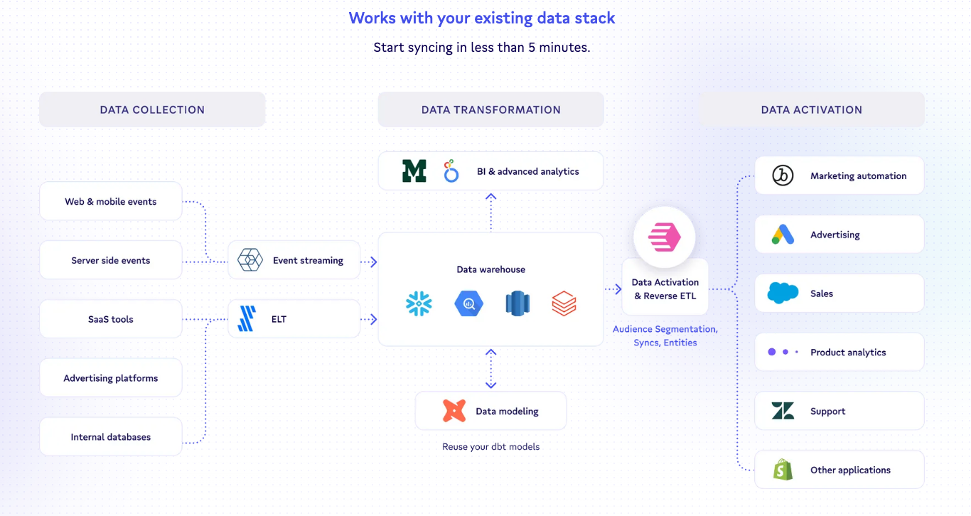 Reverse ETL / Data ActivationのSaaSは、rudderstack, Census , hightouch があります。