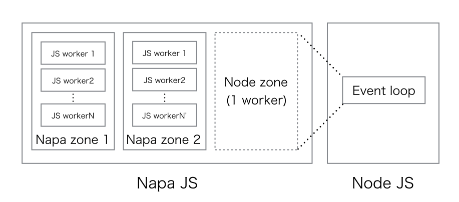 ゾーンには2タイプあります。Napa zoneとNode zoneの二つです。Napa zoneは、切り離されたV8上のNapa.jsが管理するJavaScriptワーカーで構成されるゾーンです。Napa zoneではNode.jsのAPIが制限されています。Node zoneは、Node.jsのイベントループ上の仮想のゾーンで、Node.jsのAPIが全て使えます。Napa zoneは重いタスクをこなし、一方でNode zoneはIO処理やNode.jsのAPIを利用する、という形で互いに補完し合います。