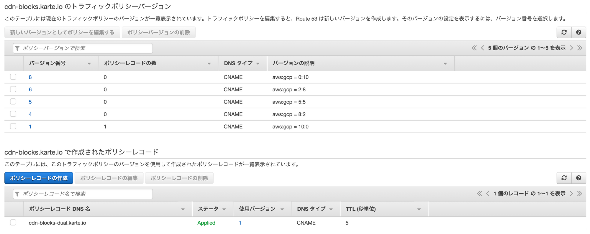 問題無い状態のときは、cdn-blocks-aws.karte.ioに100%のトラフィックが流れるようになっており、AWSに問題が起こった際に、cdn-blocks-gcp.karte.ioにトラフィックを切り替えます。