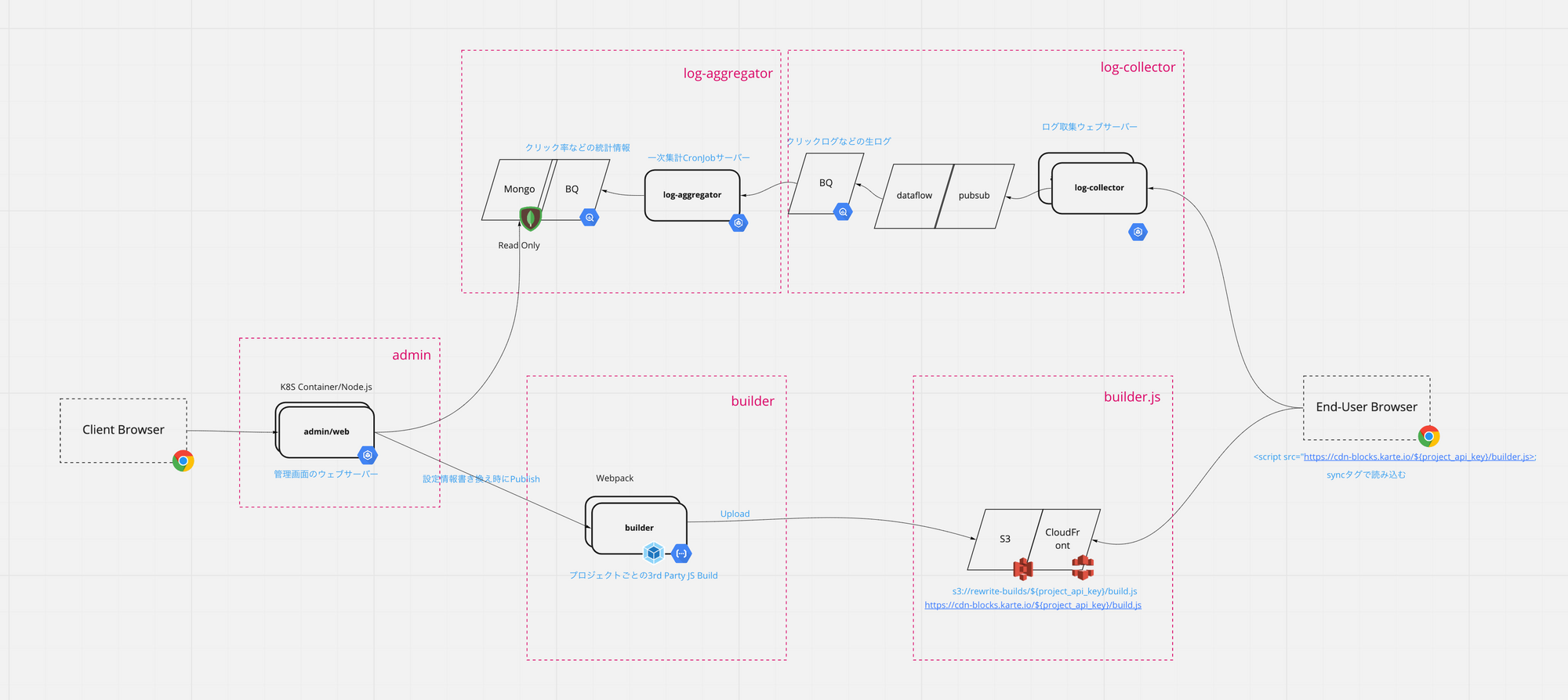 builder componentから生成されたbuilder.jsはS3に格納され、CloudFrontによって配布されます。