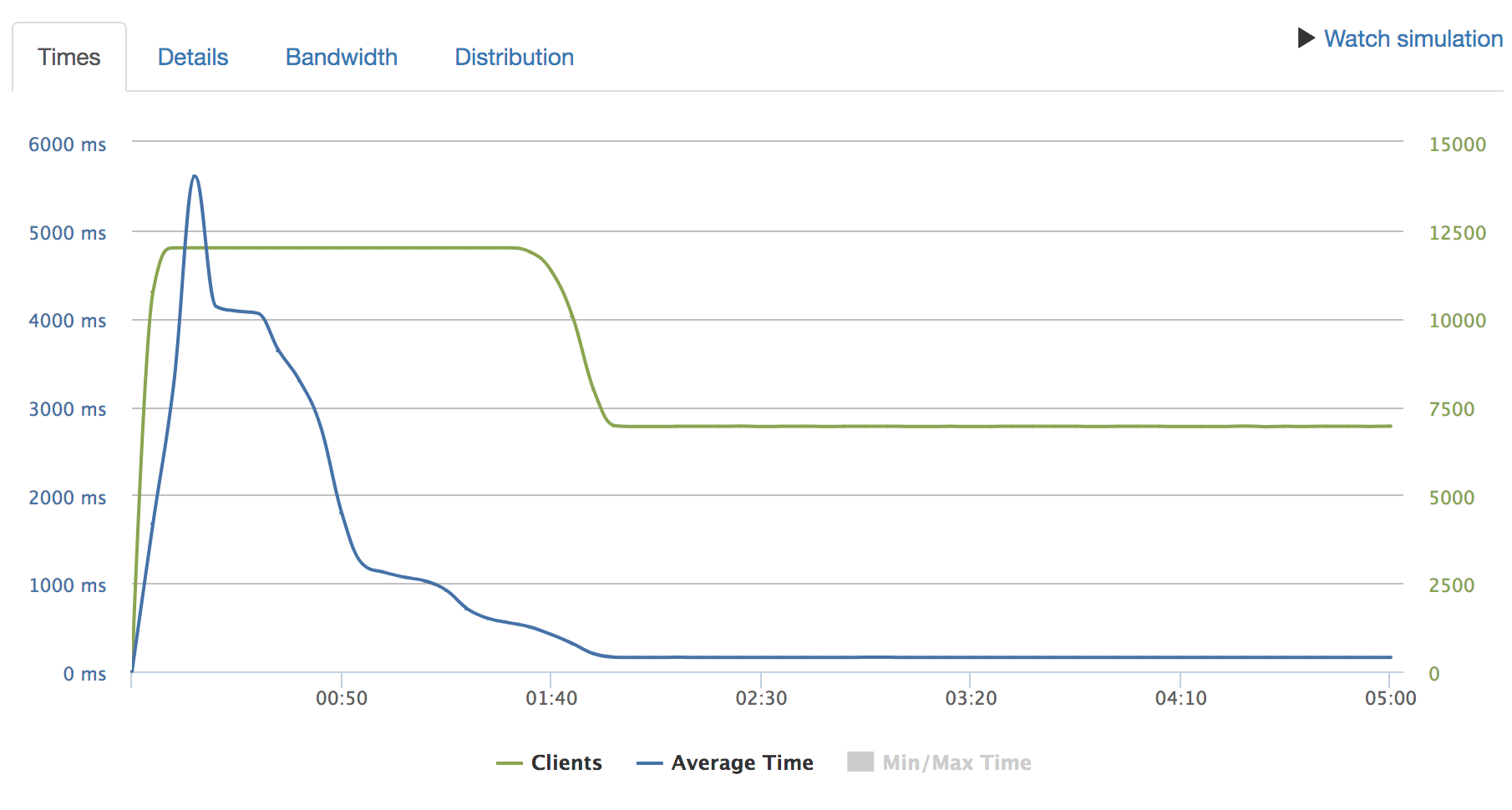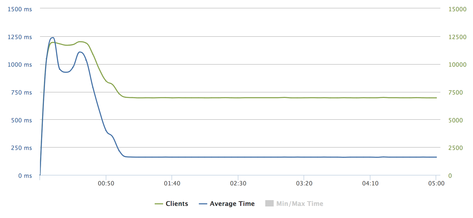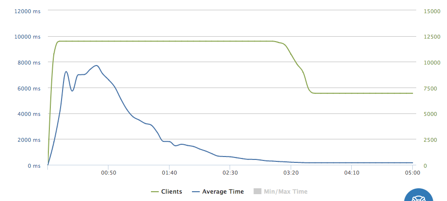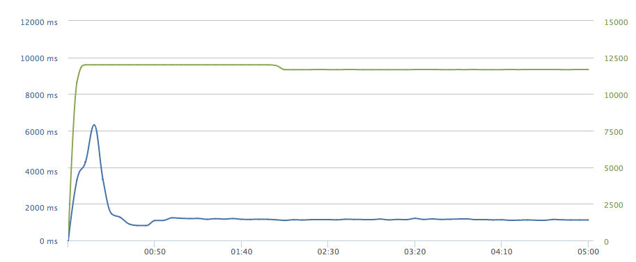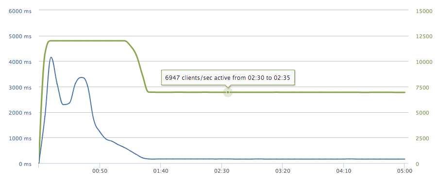 緑のラインはclient数で、秒間6000のclientが立ち上がります。