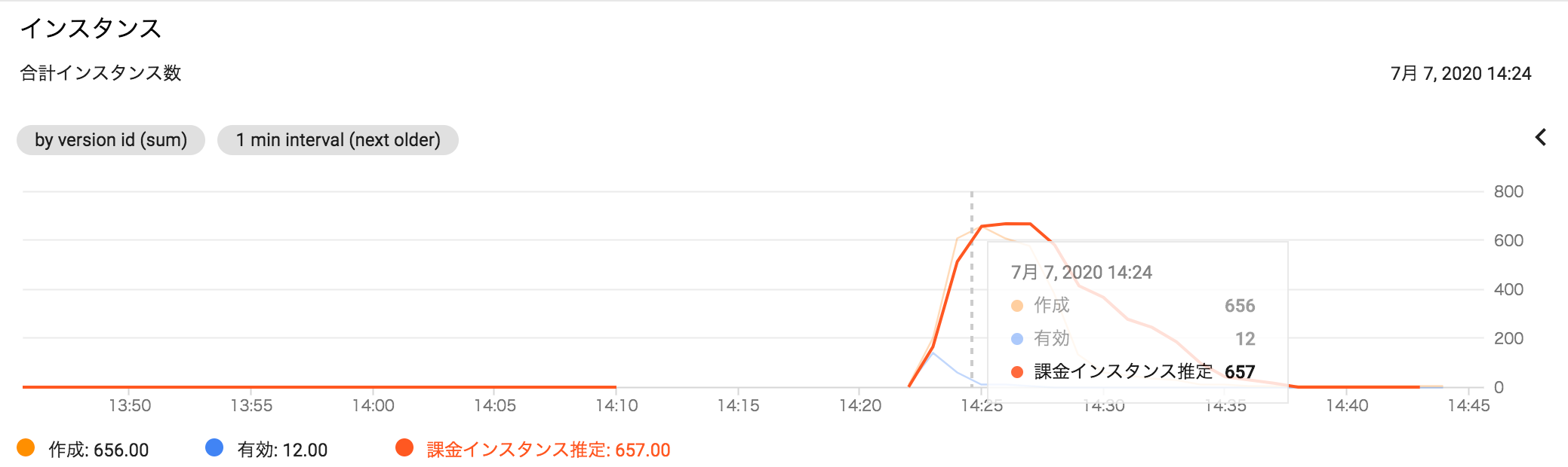 - スパイク時に余分なインスタンスを含めて、657インスタンスくらいまでスケールしている