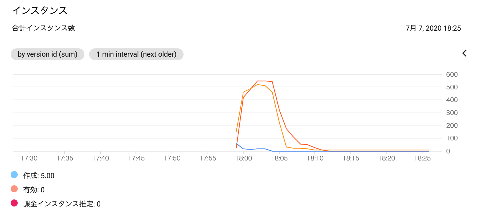 - スパイク時に余分なインスタンスを含めて、550インスタンスくらいで、下がった